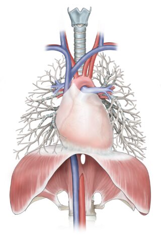 心臓の下にある大きなキノコの傘のようなものが横隔膜です。