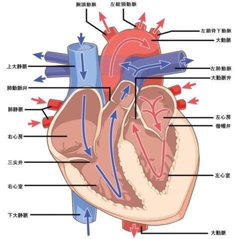 肺で二酸化炭素と酸素が交換され、血液は、肺静脈から左心房に入ります。そして左心室から大動脈を通して全身に血液が送られます。