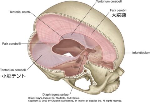 小脳テントは、大脳と小脳を分ける、硬膜(文字通り硬い膜です)です。側頭骨は、小脳テントと繋がっています。
